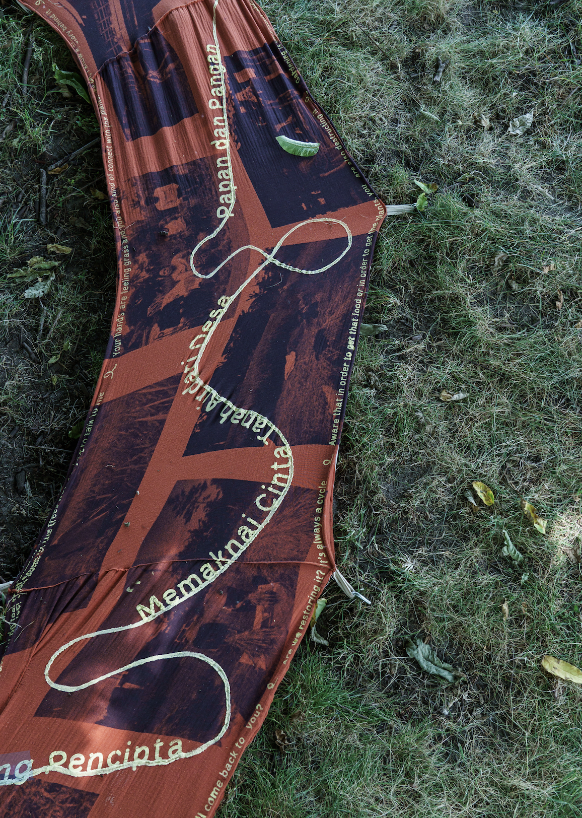 “Rematriation of Our Land: A Ritual of Weaving Ancestral Knowledge” is an immersive installation of an artistic research in continuation from an upcoming graduation project which involves a film and a tapestry to visualize the urgency to connect with other living bodies (human and non-human) to reimagine a more compassionate relationship with each other and Mother Earth. Rooted in the traditional Javanese belief of ‘Kejawen’, which emphasizes respecting our Mother Land, and research from Indigenous communities in Indonesia reveals various practices, including ‘Gotong Royong’ and ‘Lumbung’, to underscore the notion of working together to show our collective gratitude and care for Mother Earth. Each gesture is intertwined, resembling a woven tapestry that creates a single, unified gesture of reciprocating gratitude. The project involves analog printing methods such as cyanotype and silkscreen to rethink materials as collaborators or partners and involve them as part of my research towards a more regenerative artistic process. I aim to reach out to other practitioners in various fields, especially farmers, as they have an influential role within my family’s ancestral background, to relearn certain practices and find ways to connect to other human and non-human bodies from different backgrounds to find a common thread.