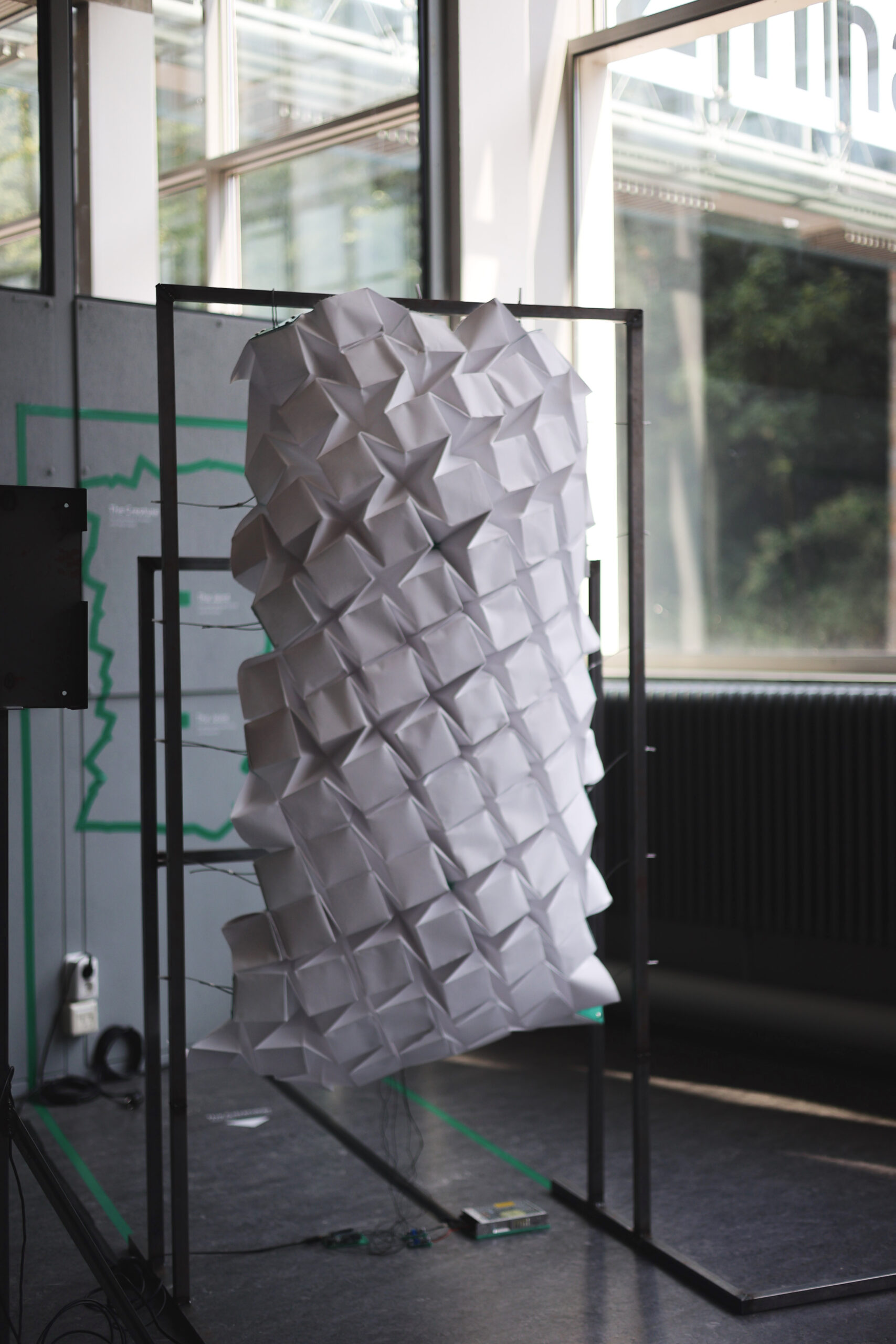 Through the integration of an interface and a responsive paper installation, a compelling metaphor is constructed: a breathing ‘creature’ — an embodiment of motion and latent stress — responds to the audience’s interaction with the screen. The viewer becomes the creature’s caretaker, invited to engage with its rhythms and reflect on the nature of their interaction.